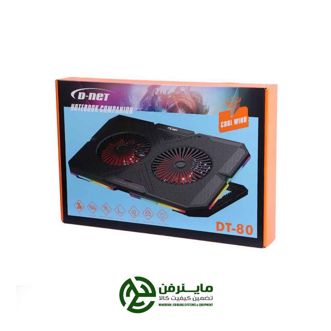 کول پد DT-80 از برند D-NET با دو فن بزرگ ۱۴۰ میلی‌متری، خنک‌کنندگی قدرتمند و یکنواختی ارائه می‌دهد. نورپردازی RGB ظاهر جذابی به محصول می‌دهد و قابلیت تنظیم سرعت فن و تنظیم ارتفاع در چند سطح استفاده از آن را راحت‌تر می‌کند. وجود دو پورت USB و گیره نگهدارنده لپ‌تاپ، کارایی این مدل را کامل کرده است. DT-80 برای لپ‌تاپ‌های ۱۴ تا ۱۷ اینچ انتخابی مناسب و کاربردی است